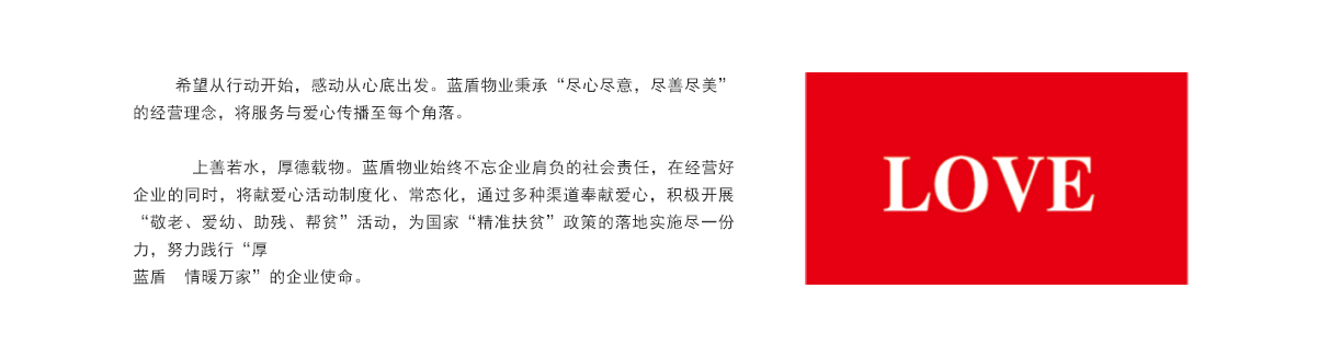 藍(lán)盾物業(yè)服務(wù)集團(tuán)有限公司是一家專業(yè)做物業(yè)服務(wù)類的集團(tuán),包含了:物業(yè)管理、物業(yè)排名、住宅物業(yè)、政府物業(yè)、學(xué)校物業(yè)、養(yǎng)護(hù)、綠化、保安、保潔、小區(qū)物業(yè)、寫字樓物業(yè)、物業(yè)行業(yè)排名等。集團(tuán)設(shè)有董事長(zhǎng)辦公室、行政管理中心、財(cái)務(wù)管理中心、法務(wù)管理中心、運(yùn)營(yíng)管理中心、市場(chǎng)發(fā)展中心等職能部門,集團(tuán)公司下屬山東藍(lán)盾環(huán)境服務(wù)有限公司、山東藍(lán)盾不動(dòng)產(chǎn)管理有限公司、山東藍(lán)盾人力資源服務(wù)有限公司、山東頤管家商務(wù)服務(wù)有限公司、山東頤養(yǎng)苑養(yǎng)老護(hù)理有限公司、山東藍(lán)盔商貿(mào)有限公司、濟(jì)寧市金盾物業(yè)職業(yè)培訓(xùn)學(xué)校等7家企業(yè)。